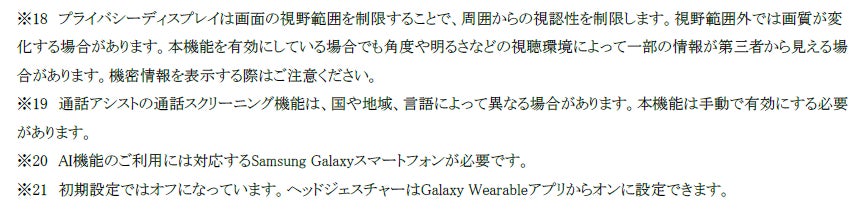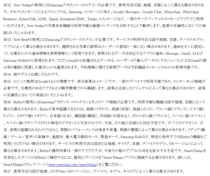 ※1 一部のGalaxy AIの機能の使用には、Samsungアカウントへのログインが必要な場合があります。Samsungは、AI機能によって生成される出力の正確性、完全性、信頼性についての保証は致しかねます。Galaxy AIの機能の使用可否や種類は、国や地域、OSやOne UIのバージョン、デバイス、モデル、キャリアによって異なる場合があります。
