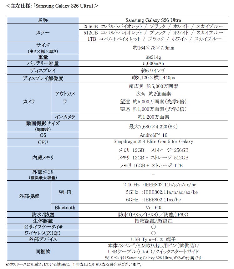 「Samsung Galaxy S26 Ultra」詳細