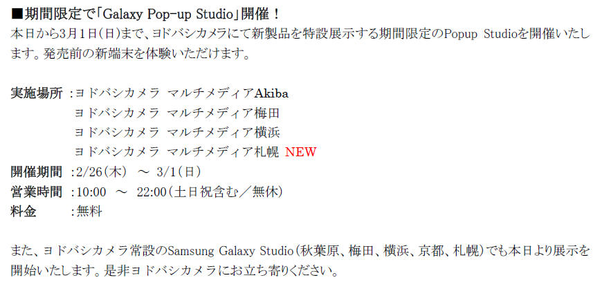 なお、本日から3月1日(日)まで、ヨドバシカメラにて新製品を特設展示する期間限定のGalaxy Pop-up Studioを開催いたします。新製品をご体験いただけますので是非ヨドバシカメラにお立ち寄りください。