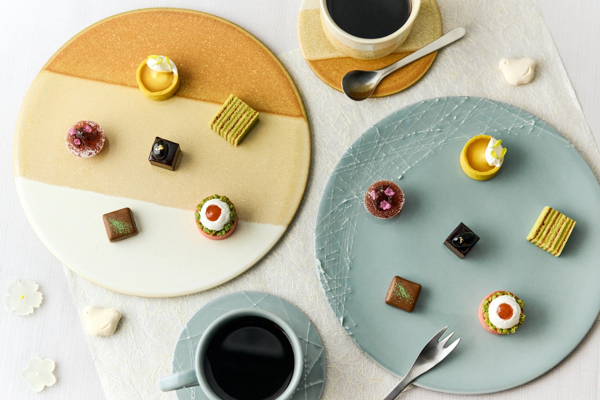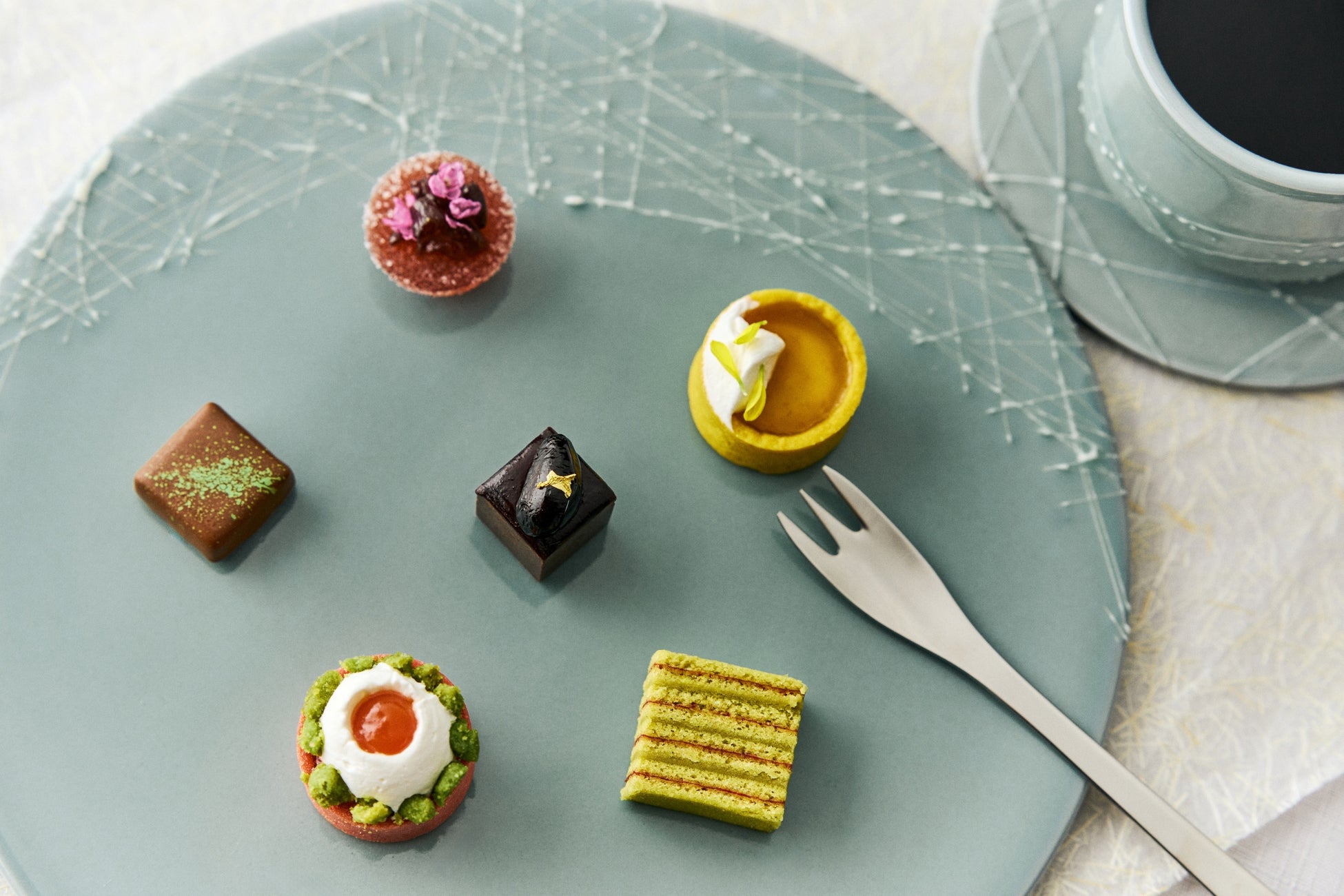 や、さっぱりとした味わいのトマト苺タルト、酸味と苦みの調和がとれた黒豆カシスチョコレートなど、全6種を用意。懐石料理の献立の一つである「八寸」から着想を得ました。懐石料理では八寸を提供する時が、亭主と客が盃(さかずき)を交わし閑談する最もくつろぎのひと時であり、亭主の客を思う気持ちを伝える時であると言われています(*2)。また、凛とした青色の器は、京都の町の発展を語るのに欠かせない「高瀬川」をイメージし、清水五条に清水焼の窯を構える蘇嶐窯(そりゅうがま)に製作を依頼しました。器を窯で焼く際に、その置く場所によって器の色味の出方が変わることから、川の流れを想起させます。空間やストーリー、器もまるごと楽しむカフェタイムを過ごせます。