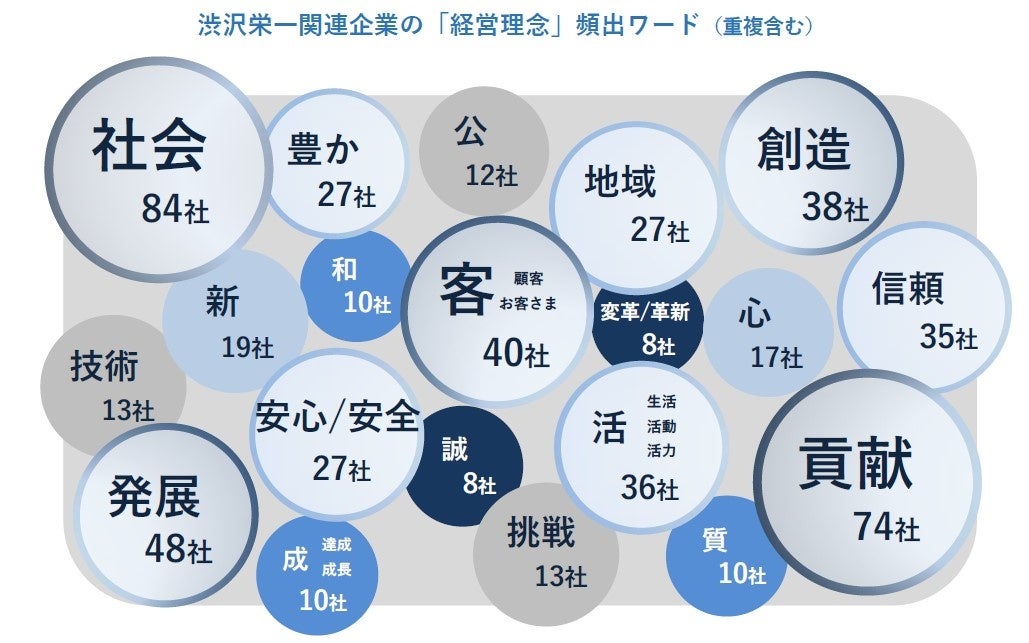 社会のために尽くそうとした渋沢の想いは、企業の存在意義を示す「経営理念」にも込められている。社会、貢献、発展、客(顧客)、創造などの言葉が頻出し、広い視野を持って未来を創ろうとする心構えが表れている。