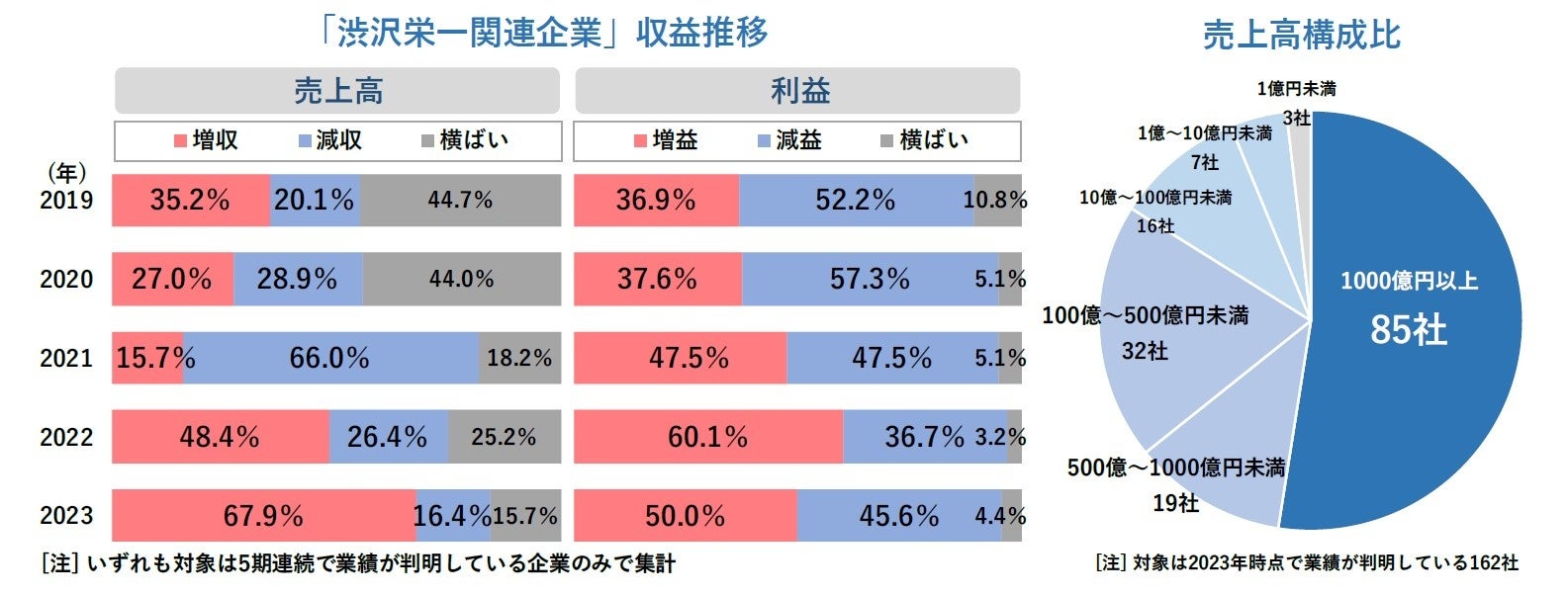渋沢栄一関連企業には上場企業を含めた大企業が多く名を連ねており、売上高1000億円以上の企業は85社と半数を超えている。また、2023年までの5期における推移をみると、新型コロナが直撃した2021年こそ減収が3分の2を占めたものの、2023年は7割近い企業が増収を果たした。利益面でも直近では半数前後の割合で増益となっており、23年に「増収増益」だった企業は65社だった。