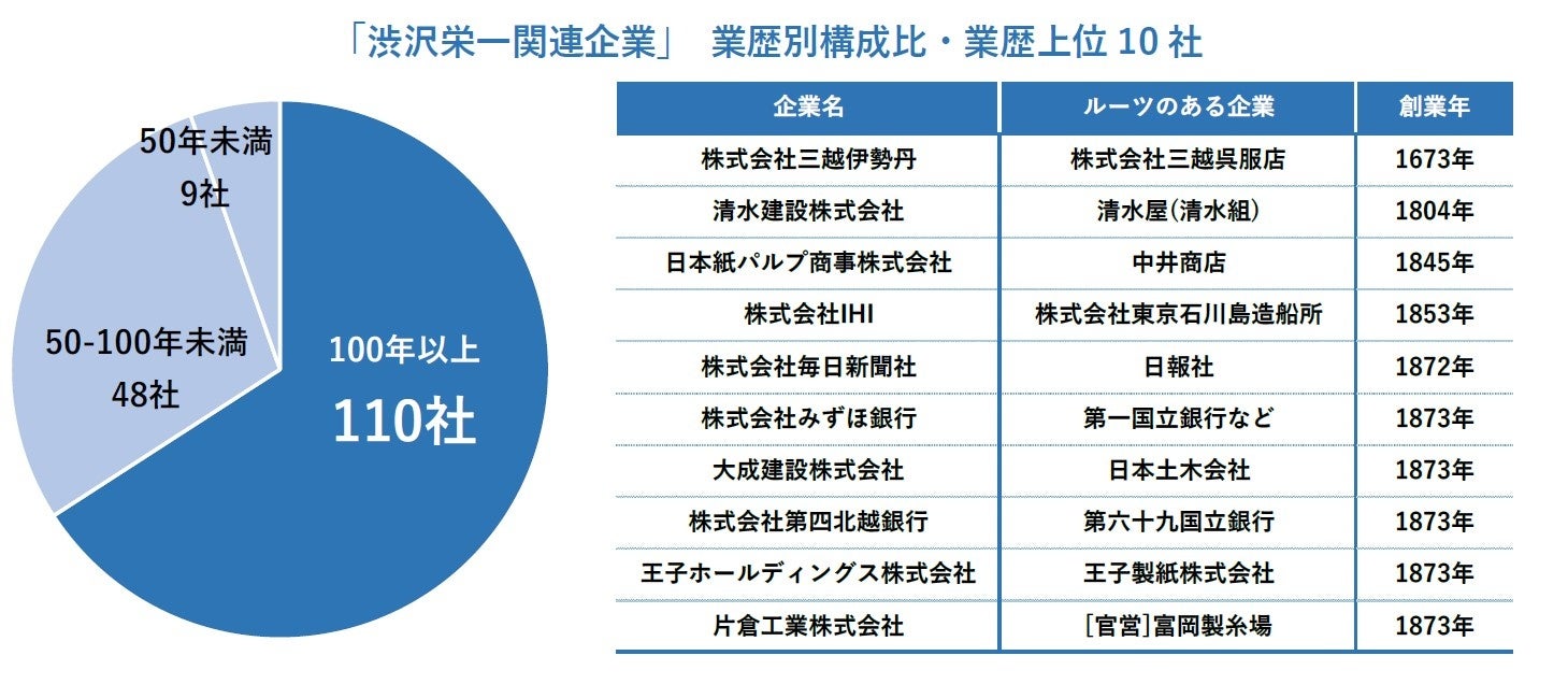 業歴別でみると、創業・設立から100年を超える「老舗企業」は167社のうち110社を数えた。合併・被合併などを繰り返すなかで会社新設となり業歴が浅いケースも見られるが、多くは渋沢が活躍した時代に興された企業が今もそのまま続いている。平均業歴は111.4年だった。