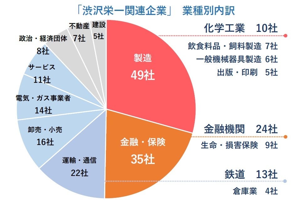 また、金融・保険が35社で続き、鉄道事業が大半を占める運輸・通信(22社)も続いた。また、電気・ガス事業者(14社)などインフラ関係の業種が多く見られる。渋沢栄一が活躍した明治時代は日本が資本主義経済の礎を固める時期であり、その当時に求められていた事業を次々に興したことが、現存している企業からも読み取れる。