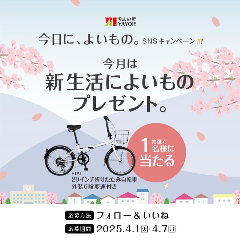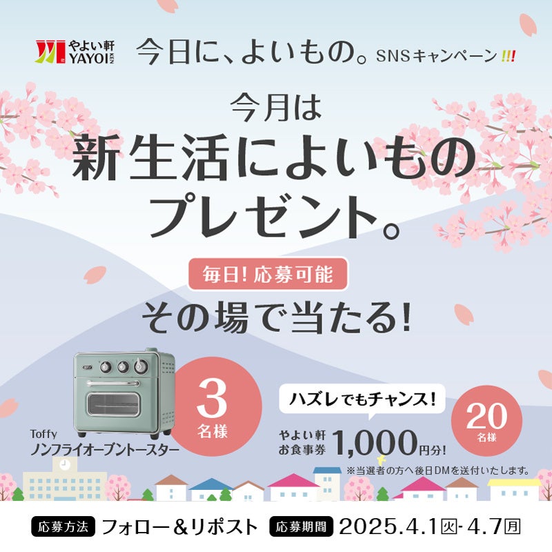 このたび日本国内の「やよい軒」では、やよい軒公式X・公式Instagramにおいて、3月より毎月『今日に、よいもの。』キャンペーンを実施しております。4月は『新生活によいもの』をプレゼント!毎月催事に合わせたプレゼントをご用意しておりますので、ぜひ、この機会にキャンペーンにご参加ください。