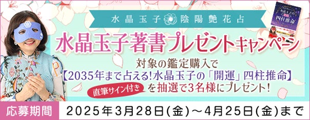こちらの発売を記念し、対象の鑑定をご購入の方に「2035年まで占える!水晶玉子の「開運」四柱推命」直筆サイン本を抽選で3名様にプレゼントいたします。ぜひ奮ってご応募ください。