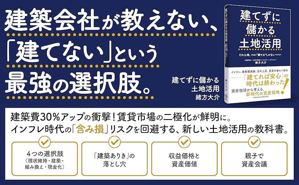 本書は、建築費がコロナ前から約30%も高騰し、「建てること」自体がリスクになりつつある現代において、「本当に今、建てるべきなのか?」を冷静に見極めるための一冊です。一級建築士であり、公認不動産コンサルティングマスターでもある著者の緒方大介氏が、「土地活用=建築」という従来の常識を覆し、駐車場経営、売却+資産組み換え、現金化など「建てない」選択肢を含めた4つの活用方法を、実際の相談事例とともに徹底解説します。「節税目的の土地活用」に潜む落とし穴や、資産価値の考え方、次世代に負担を残さない不動産管理術まで、地主・不動産オーナー必読の内容となっています。