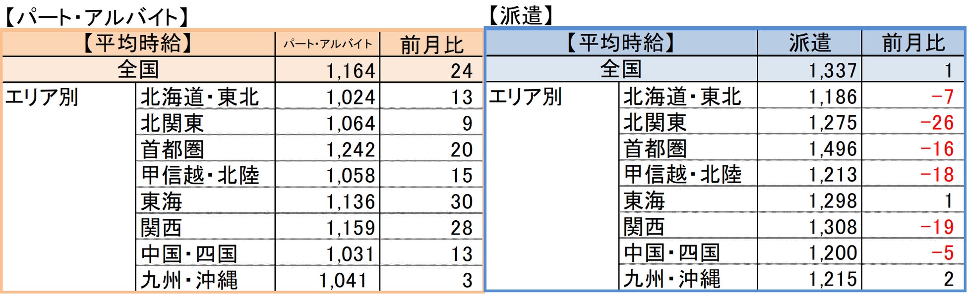 【パート・アルバイト】全国・全職種平均時給は1,164円。前月比+24円。前年同月比+21円。 【派遣】全国・全職種平均時給は1,337円。前月比+1円。前年同月比+5円。 【傾向】 パート・アルバイトの平均時給は、同条件で比較可能な2020年9月以降で最高だった。前月比で見ると、全エリアかつ12職種中11職種でプラスとなった。 時給が上昇した主な要因は、全職種平均より時給相場の低い「フード・飲食」「小売・販売」カテゴリの求人数が前月から大幅に減少したこと。12月は、市場全体として求職者の動きが鈍る傾向がある。特にしゅふは、学校が休暇に入り家に子どもがいる上に、イベント事が多く忙しい時期なので、就職活動がしづらい。それを見越して求人の掲載を一時的に止める企業の動きの影響もある。 派遣の平均時給は、職種別に見ると「オフィスワーク」「クリエイティブ・エンジニア」「理美容・リラクゼーション」カテゴリ等で平均時給が前月比で大幅にマイナスとなった。その一方で、全職種平均より時給相場の低い「軽作業・物流・製造」カテゴリの求人数が前月から半減し、全体平均を底上げしたことで、結果的に全体平均はほぼ横ばいとなった。 |