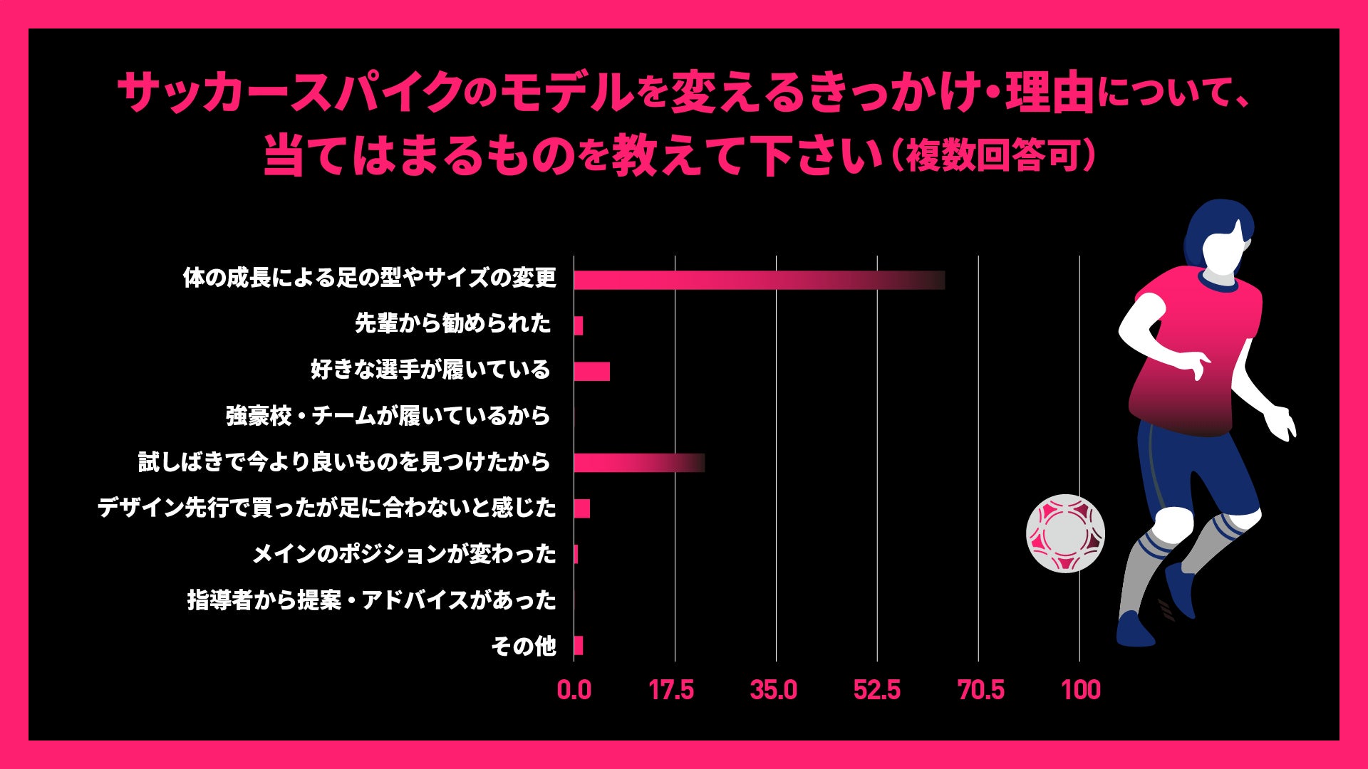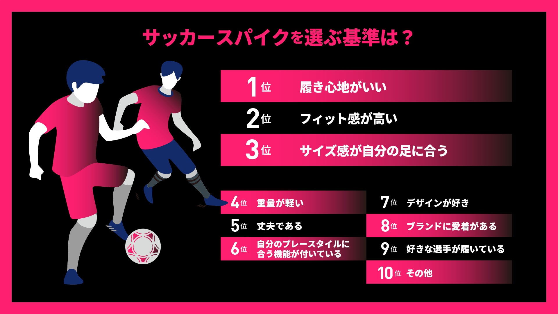 アンケート調査では現役の高校生プレーヤーに「サッカースパイクに関する実態調査」を実施。「スパイク選びの基準」や「スパイクの履き分け事情」、「モデルチェンジのきっかけ」など、スパイクに関する実態調査を幅広く行いながら、スパイクに求める「着用時の履き心地」や「プレー中のフィット感」など高校サッカー部員の最新のスパイクへのニーズを明らかにしています。