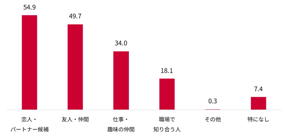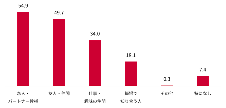 出会いを求めている人に、出会いたい相手を聞いたところ、「恋人・パートナー候補」が54.9%と最も高く、次いで「友人・仲間」(49.7%)、「仕事・趣味の仲間」(34.0%)となった。