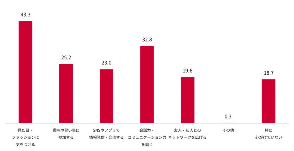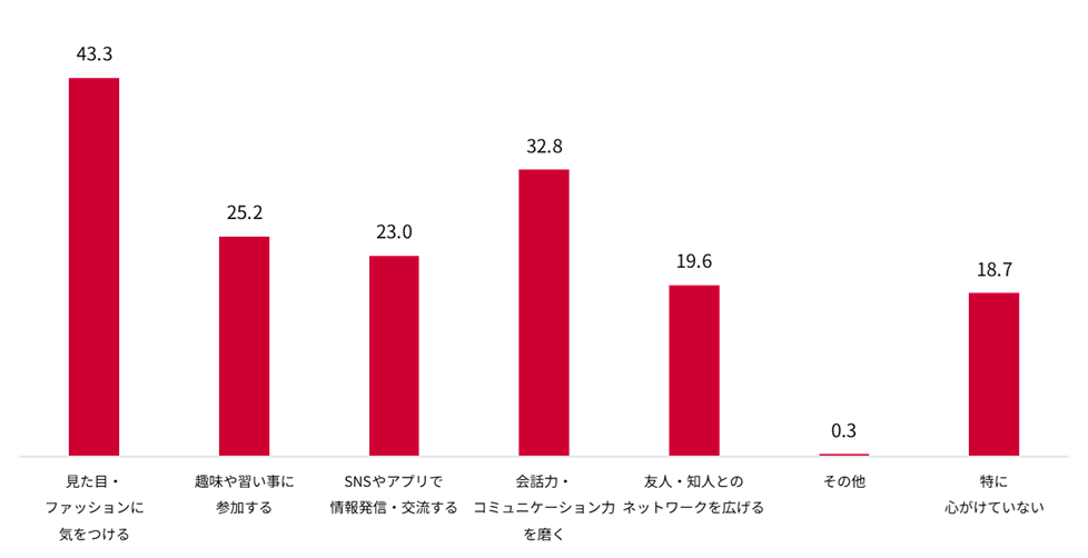 出会いのために普段から心がけていることは、1位「見た目・ファッションに気を付ける」(43.3%)、2位「会話力・コミュニケーション力を磨く」(32.8%)」となった。次いで「趣味や習い事に参加する」(25.2%)、「SNSやアプリで情報発信・交流する」(23.0%)となり、人との接点を多くすることよりも、自分の外見・内面を磨くことを心がけている様子が見られた。