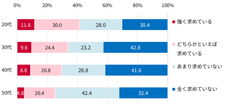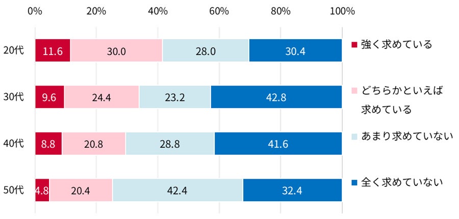 年代別で見ると、20代は出会いを求めている層が唯一4割以上となった。年代が高くなるにつれて、求めていない層が高くなる傾向が見られ、50代では74.8%と最も高い結果となった。