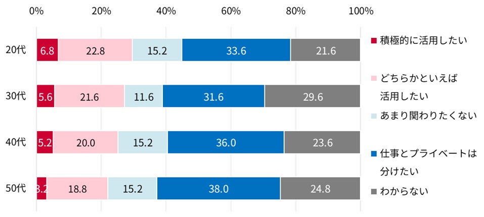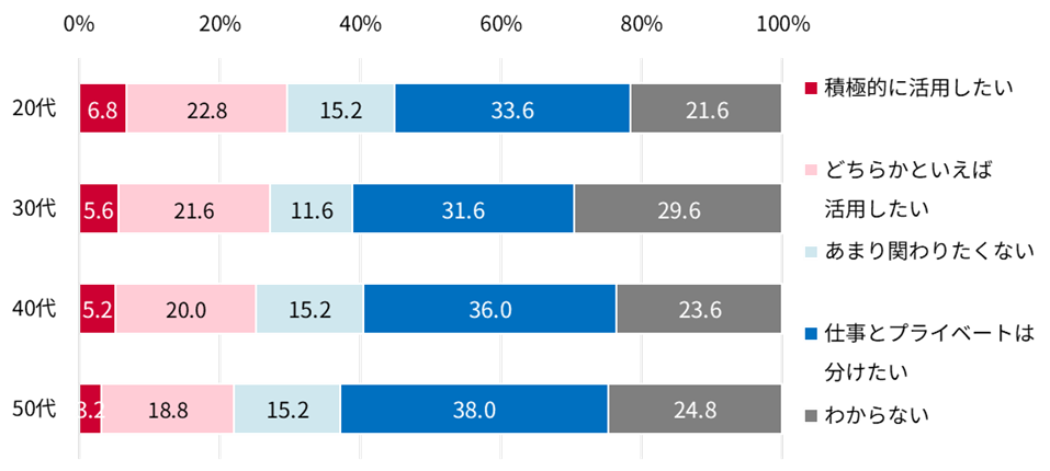 また、年代別に見ると、すべての年代で「仕事とプライベートは分けたい」が3割以上、「あまり関わりたくない」を含めると5割前後となった。年代問わず共通して、職場・仕事を出会いの機会として活用する意向は低かった。