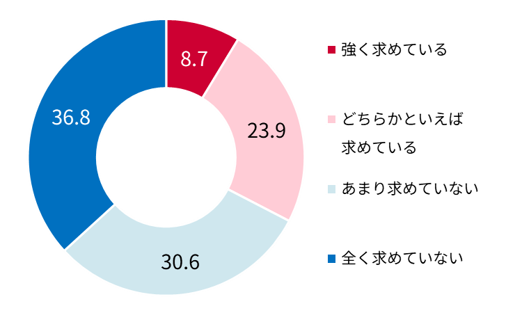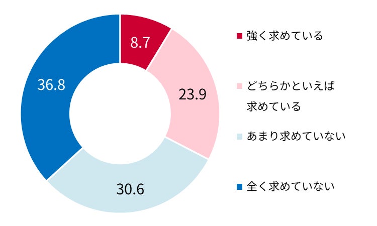 現在働いている人に、春に新しい出会いを求めているかを聞いたところ、「強く求めている」が8.7%、「どちらかといえば求めている」が23.9%となり、合わせると32.6%だった。一方、「あまり求めていない」は30.6%、「全く求めていない」は36.8%となり、67.4%が春に出会いを求めていないことが分かった。