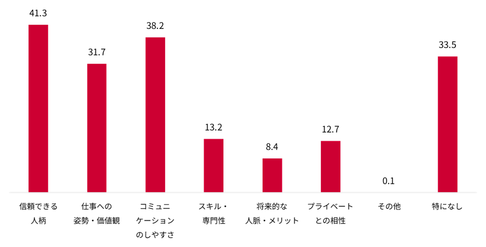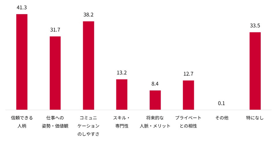 働く中での出会いにおいて重視するポイントは「信頼できる人柄」が41.3%で最多だった。「コミュニケーションのしやすさ」(38.2%)、「仕事への姿勢・価値観」(31.7%)が続いた。