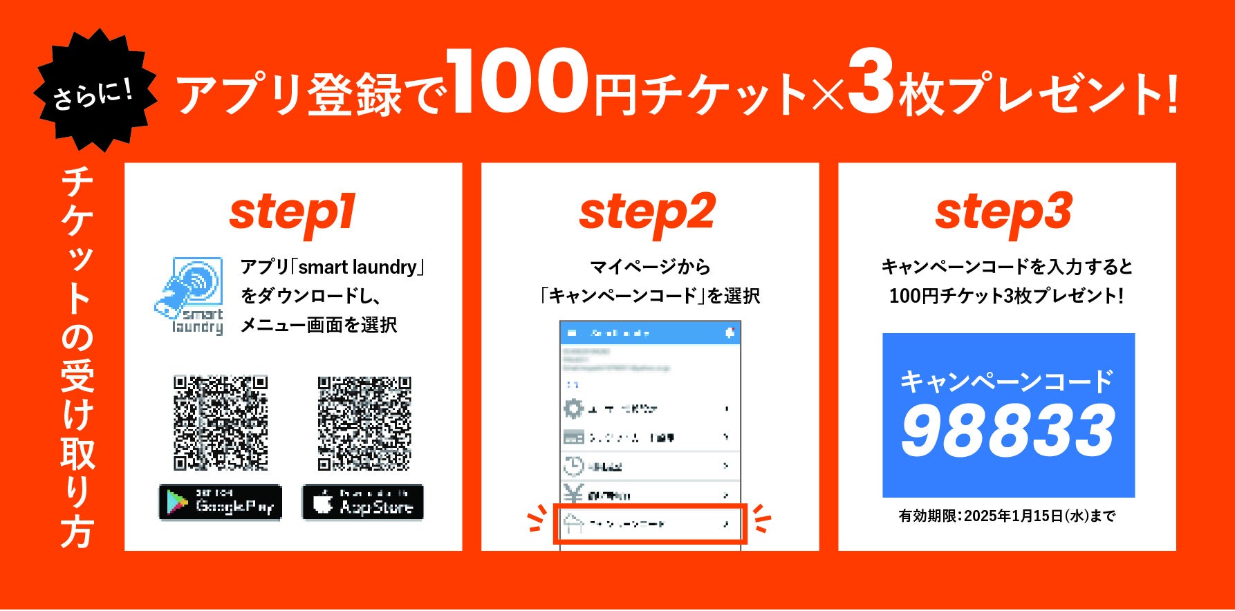 公式アプリ「smart laundry」をダウンロードし、キャンペーンコード「98833」を入力すると、100円分のランドリーチケット3枚をプレゼント!(※有効期限:2025年1月15日まで)