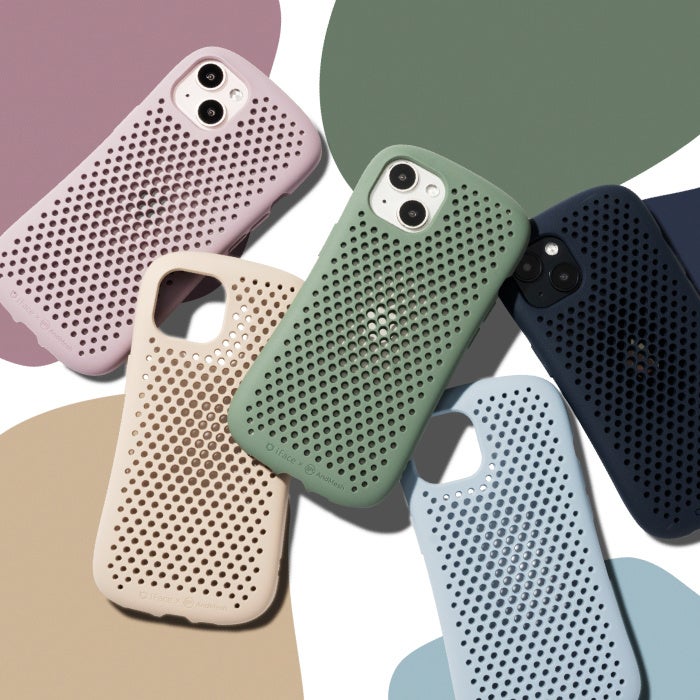 カラーはくすみのある色合いが魅力的なトレンドカラーの「ペールブルー」「ライトパープル」、「AndMesh」の人気カラー「クレイグリーン」「ベージュ」「ネイビー」の5種類を揃えました。「iFace」のカーブラインによる握りやすく落としにくい安心設計に加え、「AndMesh」のグラデーションメッシュによる軽さや放熱性、心地良い肌触りを実現。かつMIL規格準拠の耐衝撃性も兼ね備えた、スペシャルアイテムです。