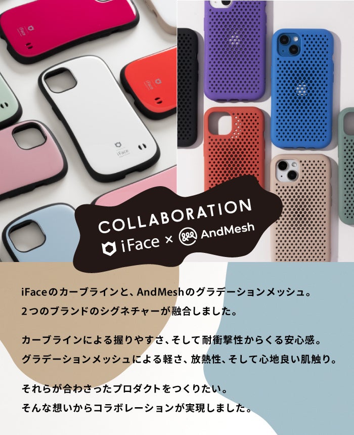 このたび「iFace」および「AndMesh」は、それぞれのブランドのこだわりを融合させたコラボレーションアイテムをリリースいたします。今回のコラボアイテムでは、「iFace」を象徴する“カーブライン”や特有の握りやすさ等「iFace」ならではの機能性と、「AndMesh」を象徴する”グラデーションメッシュ”や”握り心地の良いTPU素材”を融合。両ブランドのロゴもさりげなくあしらわれています。