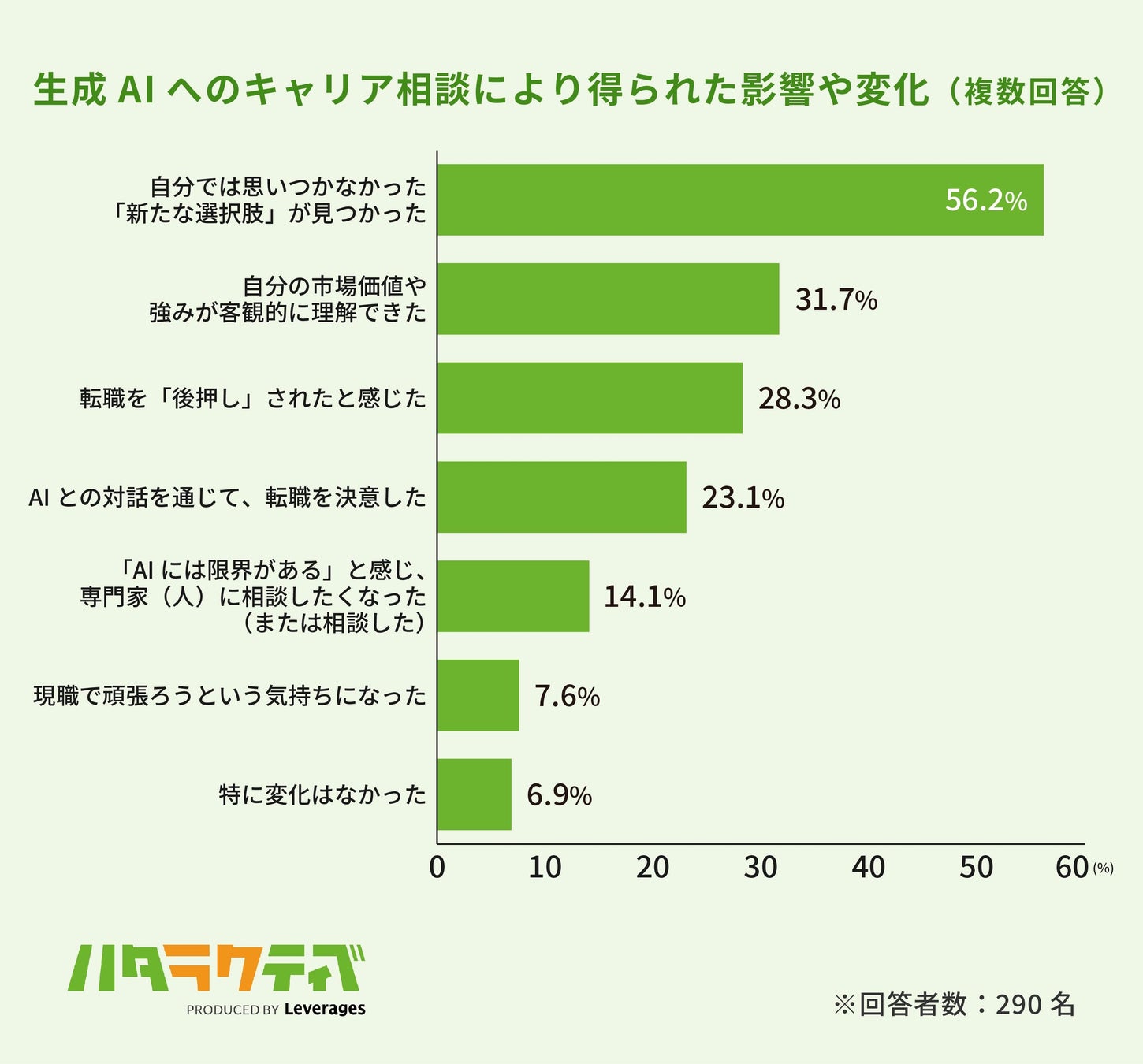 生成AIに相談したことによる変化として、「自分では思いつかなかった『新たな選択肢』が見つかった(56.2%)」や、「自分の市場価値や強みが客観的に理解できた(31.7%)」と、ポジティブな視点を得ていることがわかりました。