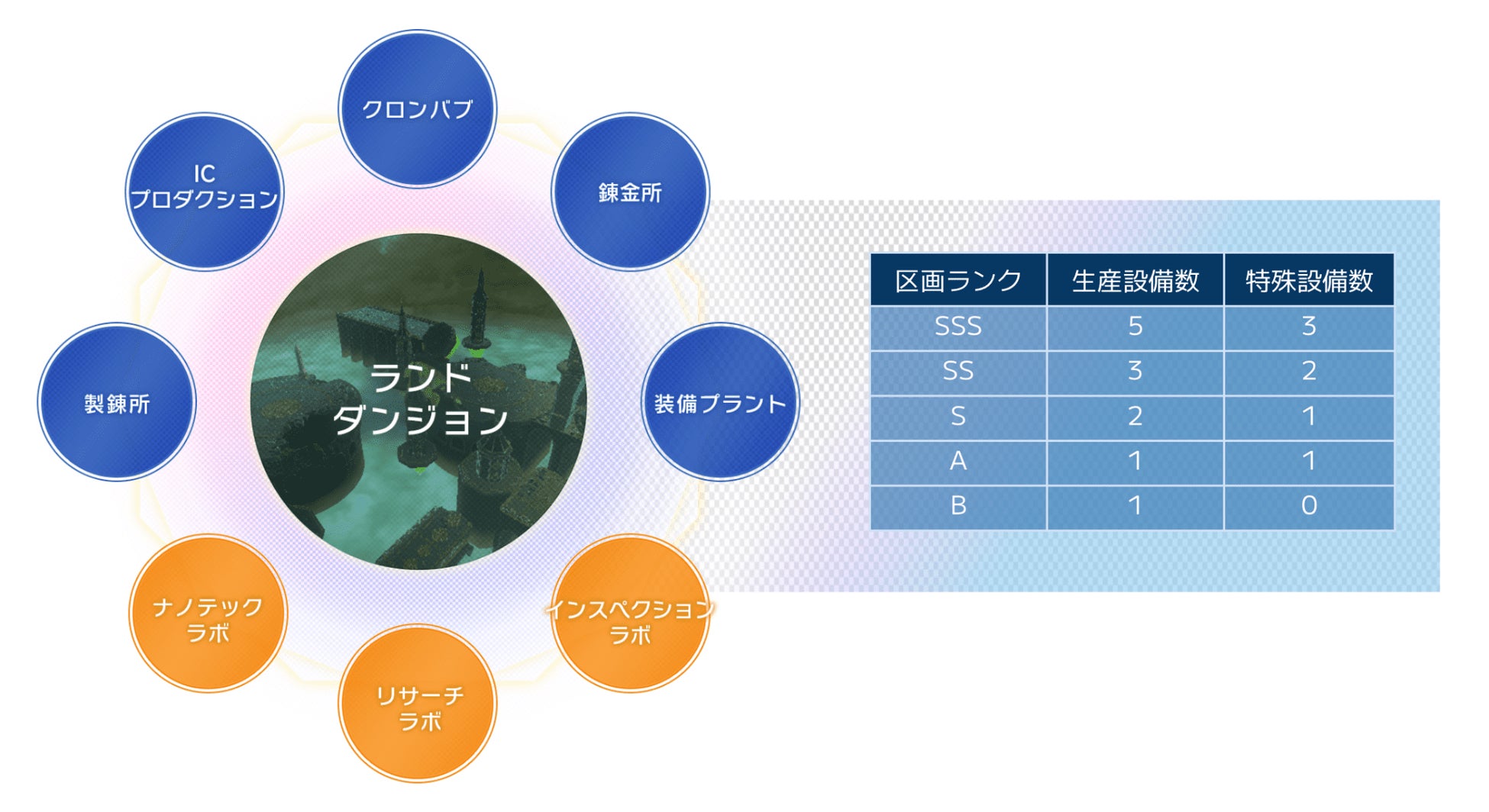 プレイヤーが保有できる不動産型のNFT資産です。数量が限定されていてかなり希少です。すべてのランドにはランドダンジョンがあります。それ以外の施設は、区画ランクに応じて付随する数が多くなります。また、施設の種類はランダムに決まるため(同種類の施設は1つだけ)、同ランクのランドでも同じではありません。