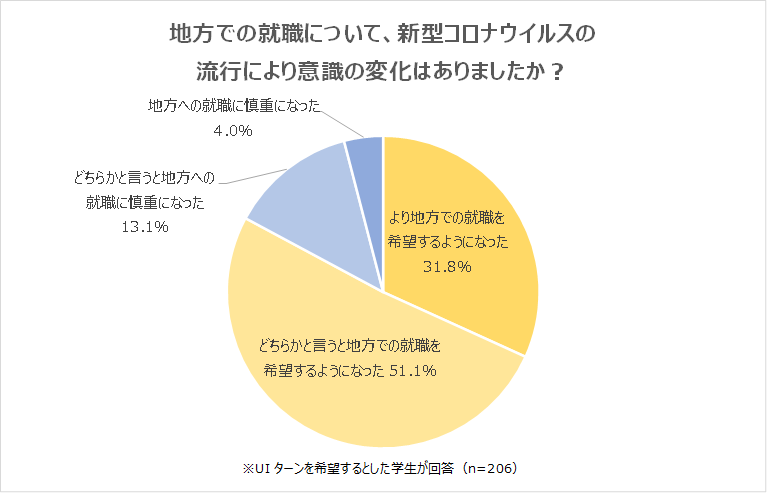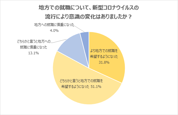 地方での就職について、「新型コロナウイルスの流行により、地方での就職を希望するようになった」と回答した学生が82.9%に上りました。「コロナのような非常事態があった際に、家族が近くにいると安心できる」「思うように帰省できないことを経験し、家族の近くに住みたいと思うようになった」「なかなか人に会えない中で周囲との繋がりの大切さを感じ、地元に貢献したいと思うようになった」などの声が上がりました。