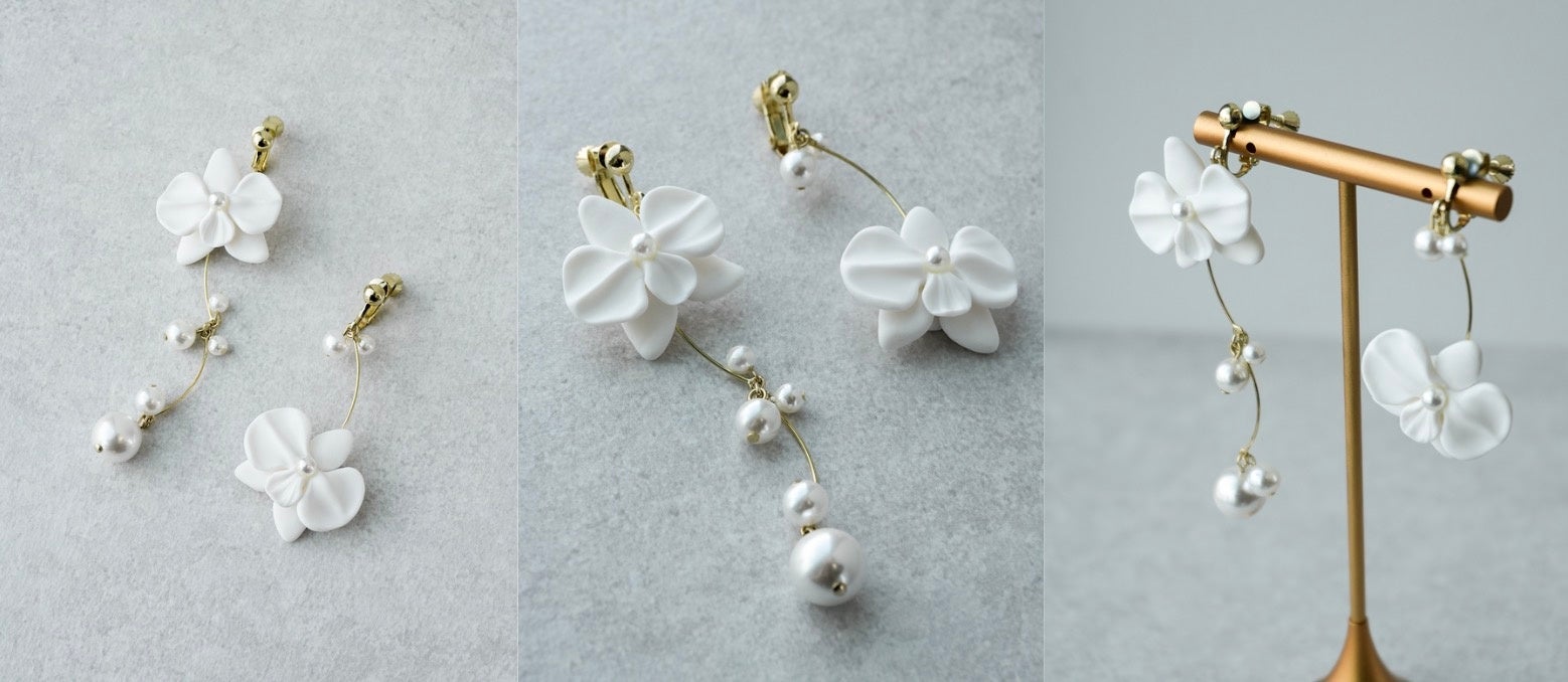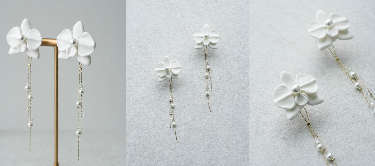 耳元に咲く大ぶりの胡蝶蘭が、花嫁さまのお顔まわりをふんわりと華やかに彩ります。きらめくチェーンにはパールとガラスビーズをあしらい、繊細な光をプラス。2way仕様でチェーンパーツは取り外し可能。シーンに合わせて印象の変化をお楽しみいただけます。
