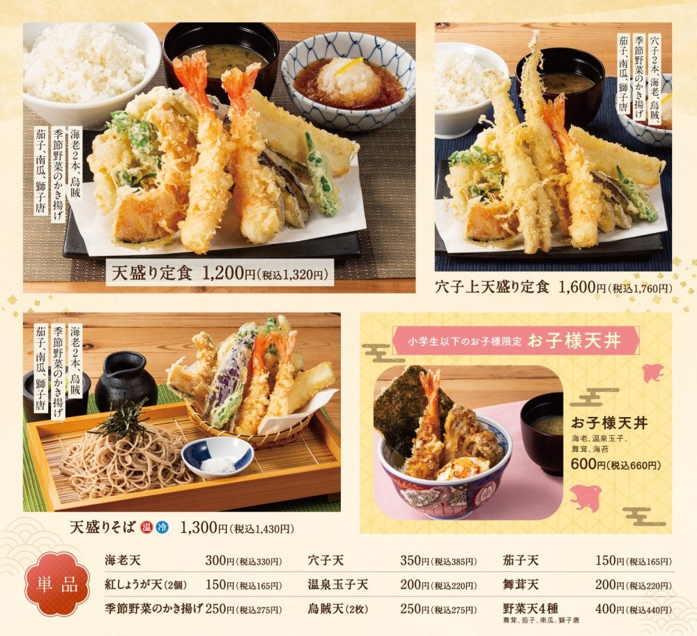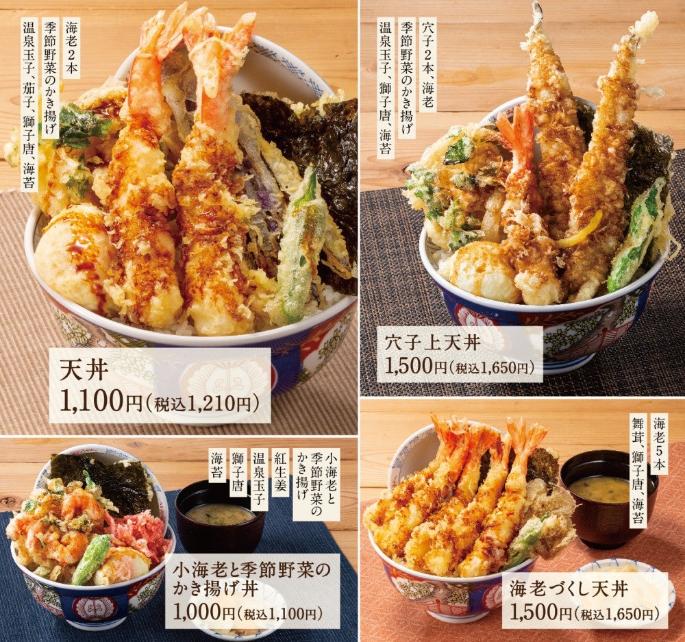 新グランドメニューには、期間限定メニューで販売した際に完売御礼が続いた「海老づくし天丼」や、さっぱりとした紅生姜天を添えた「小海老と季節野菜のかき揚げ丼」など、次は何にしようかなと思わず考えてしまうバリエーションをご用意しております。