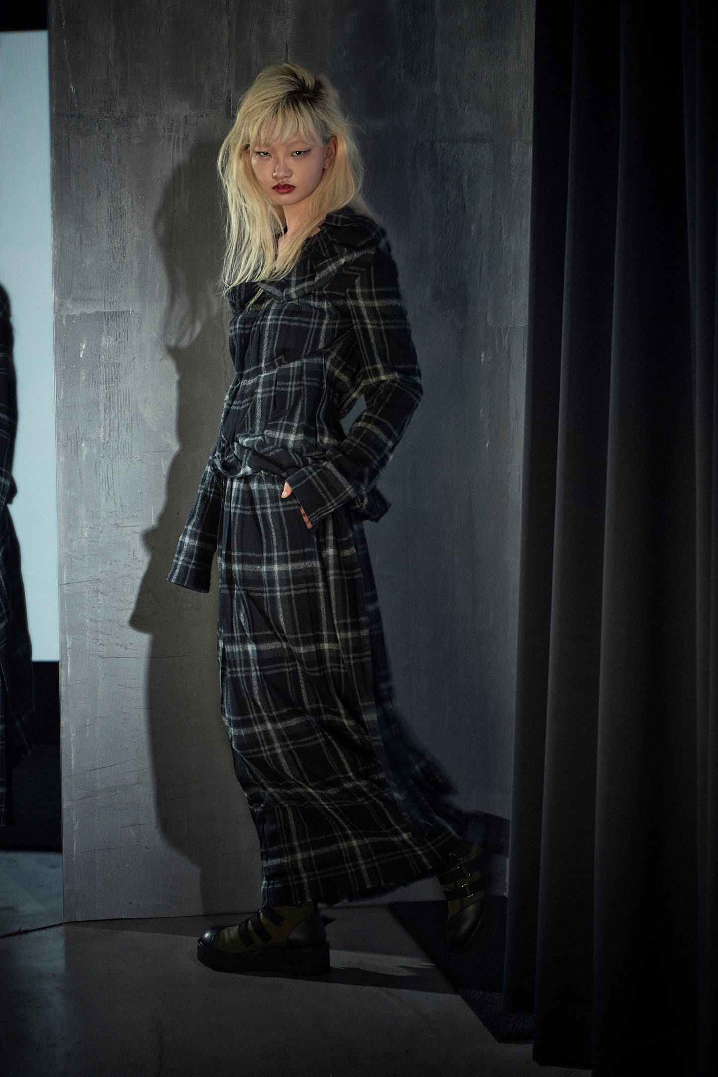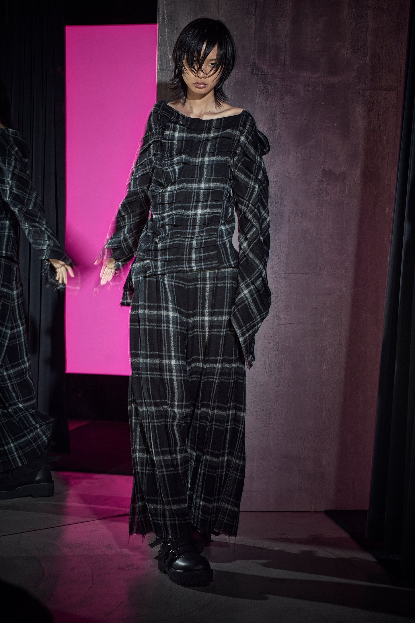 ジャケットとスカートが一体化された全域プリーツのチェックワンピース、アンガルカ風のネックライン、スパイラルスリーブ、前身頃から後身頃に続くドレープ、袖口とスカートヘムに断ち切り加工
