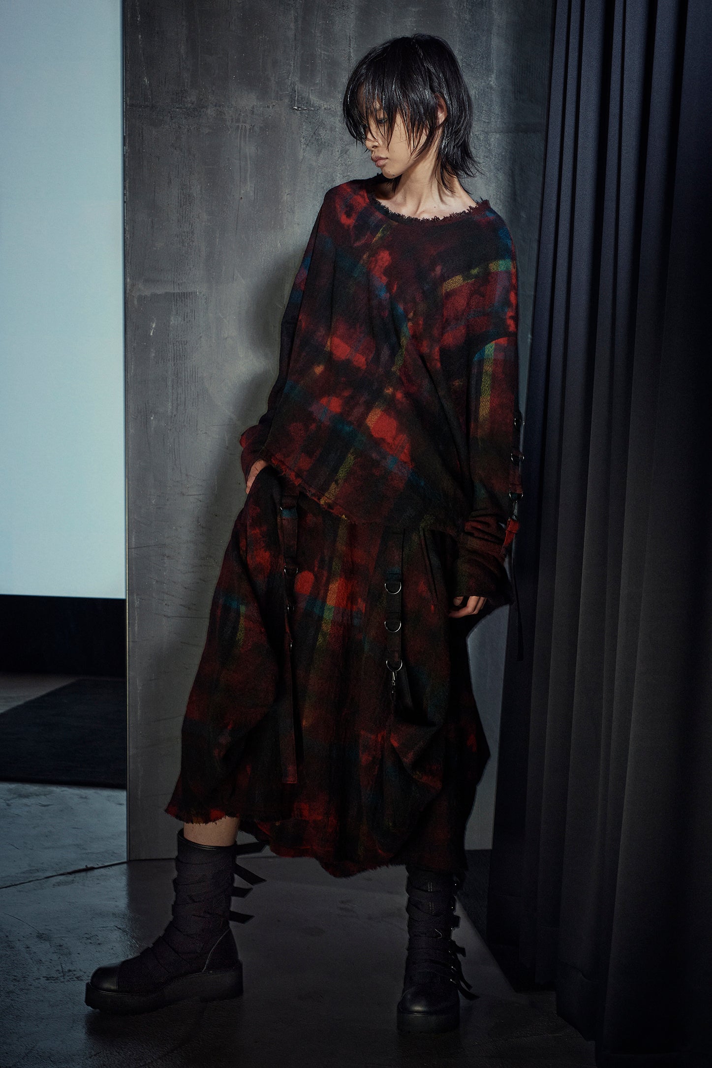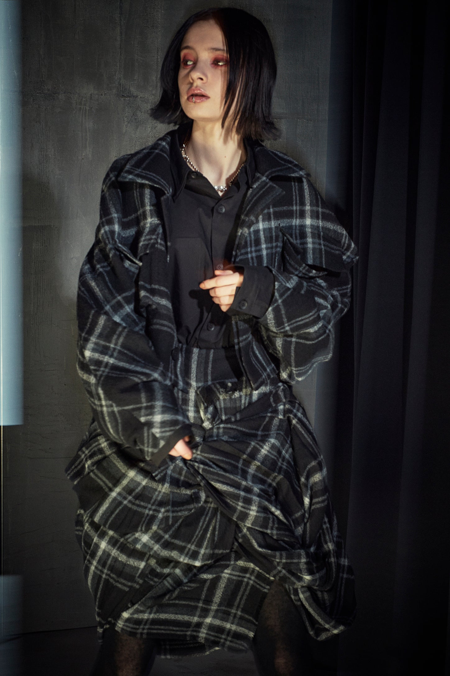 ガータースカートタイプ、左脇ファスナー、前後のDカン付きドローコードでスカート丈とドレープの調節が可能、スカートヘムに断ち切り加工、粗密度のガーゼ調チェック生地を圧縮、職人による手染め注染、柄の境界線が曖昧で滲むように混ざり合う柄、ウール