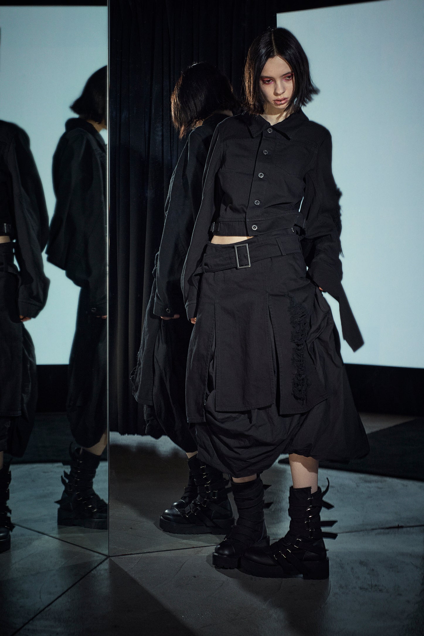 パネル切り替えスカート、脇開き、刻印入りデニムボタン、シームポケット、後身頃にボックスプリーツ、後身頃がやや長め、前身頃右側に手作業によるタテ糸カットのダメージ加工、繊細で品のあるクラッシュ感、ナチュラルなムラ感のあるブラックデニムを更に黒染め、コットン