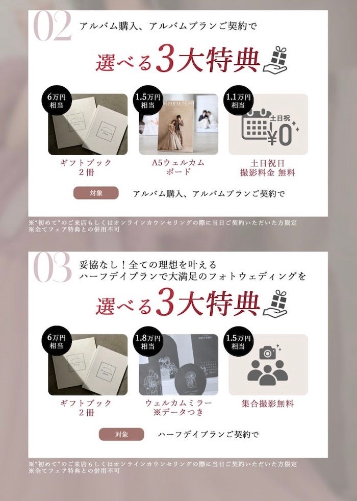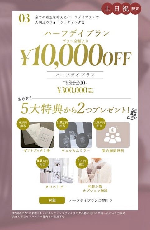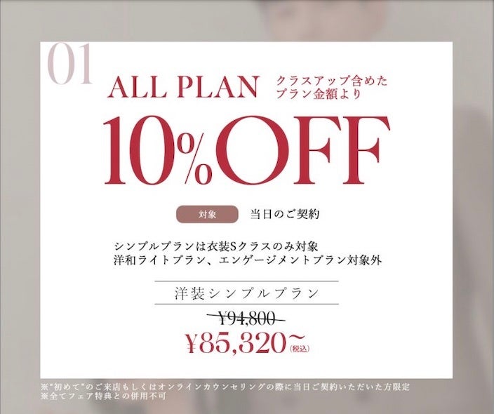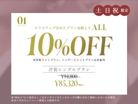 全プラン対象 当日契約で衣装クラスアップ含めた基本価格より10%OFF