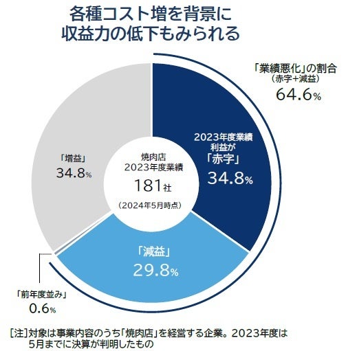 コロナ禍でニーズが高まり出店が相次いだ焼肉店は、顧客の獲得競争が激化していることに加え、円安などを要因とした食肉価格の高騰が経営を直撃している。焼肉店を中心に展開する外食企業のうち、2023年度の業績が「赤字」となった企業の割合は34.8%を占めた。前年度から利益が減少した「減益」を合わせた「業績悪化」の割合は64.6%に上り、過去10年で2番目に高い水準だった。電気・ガス代や人件費など店舗運営コストの負担増に加え、米国産や豪州産などの輸入牛肉、さらには価格を抑えたメニューで採用される安価な豚肉でも円安で価格が高騰したことが重荷となった。