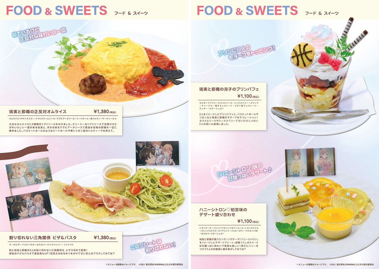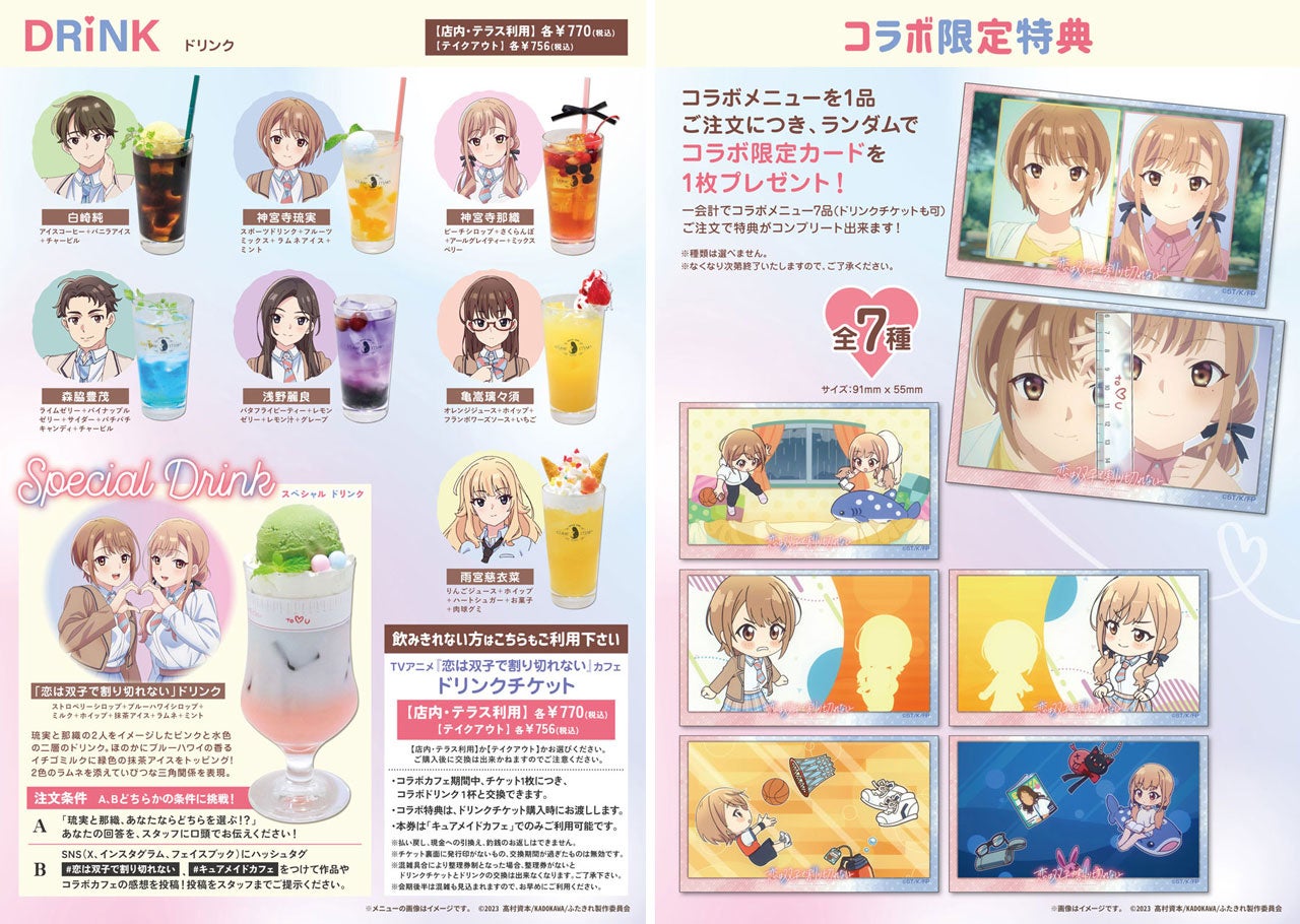ずらっとラインナップしたコラボならではのメニューや店内の展示、限定特典。TVアニメ『恋は双子で割り切れない』づくしなコラボカフェをお楽しみください。