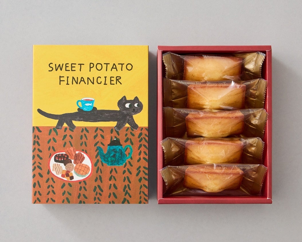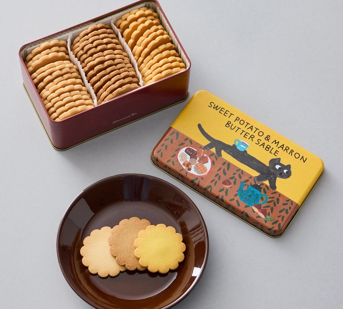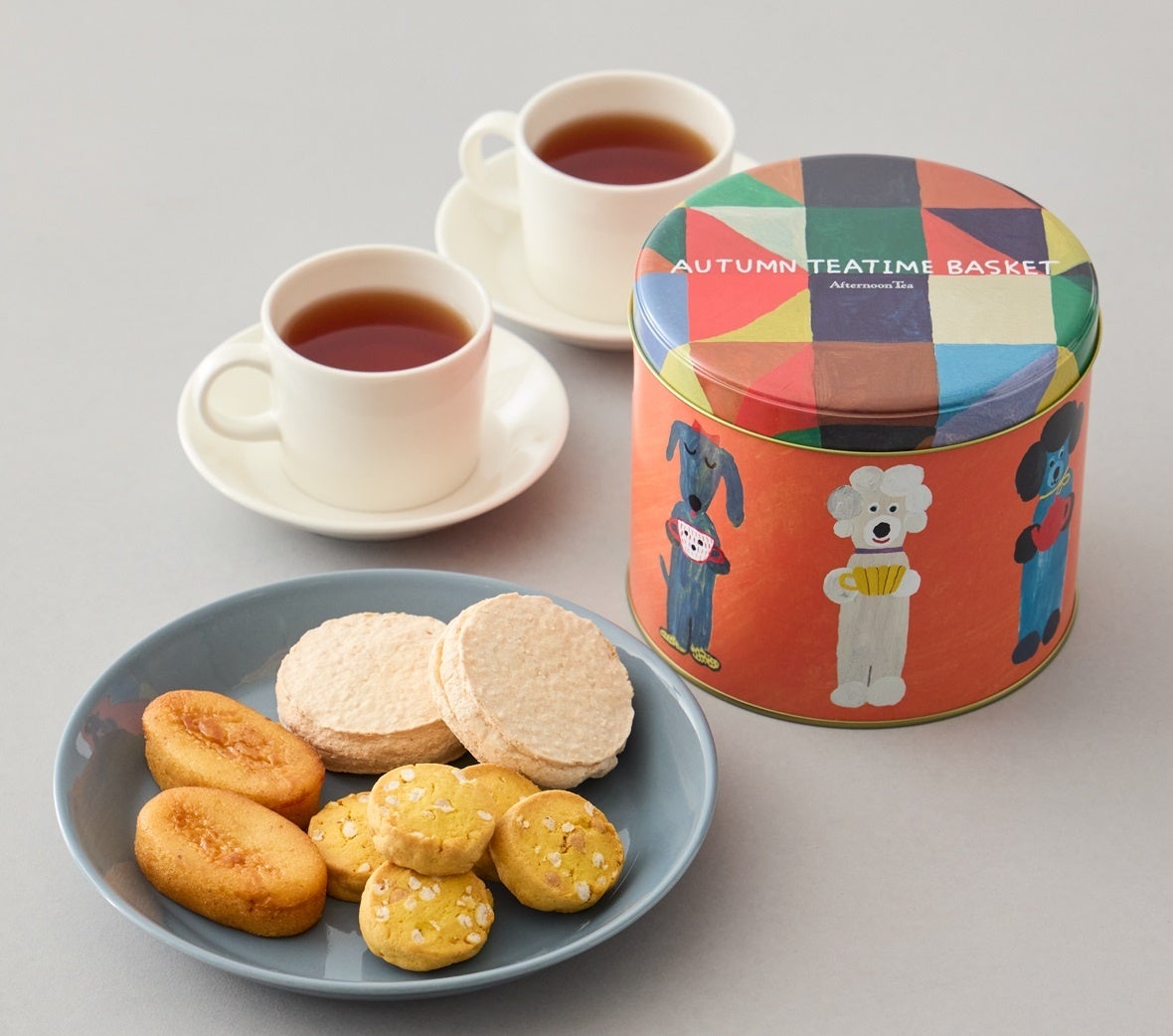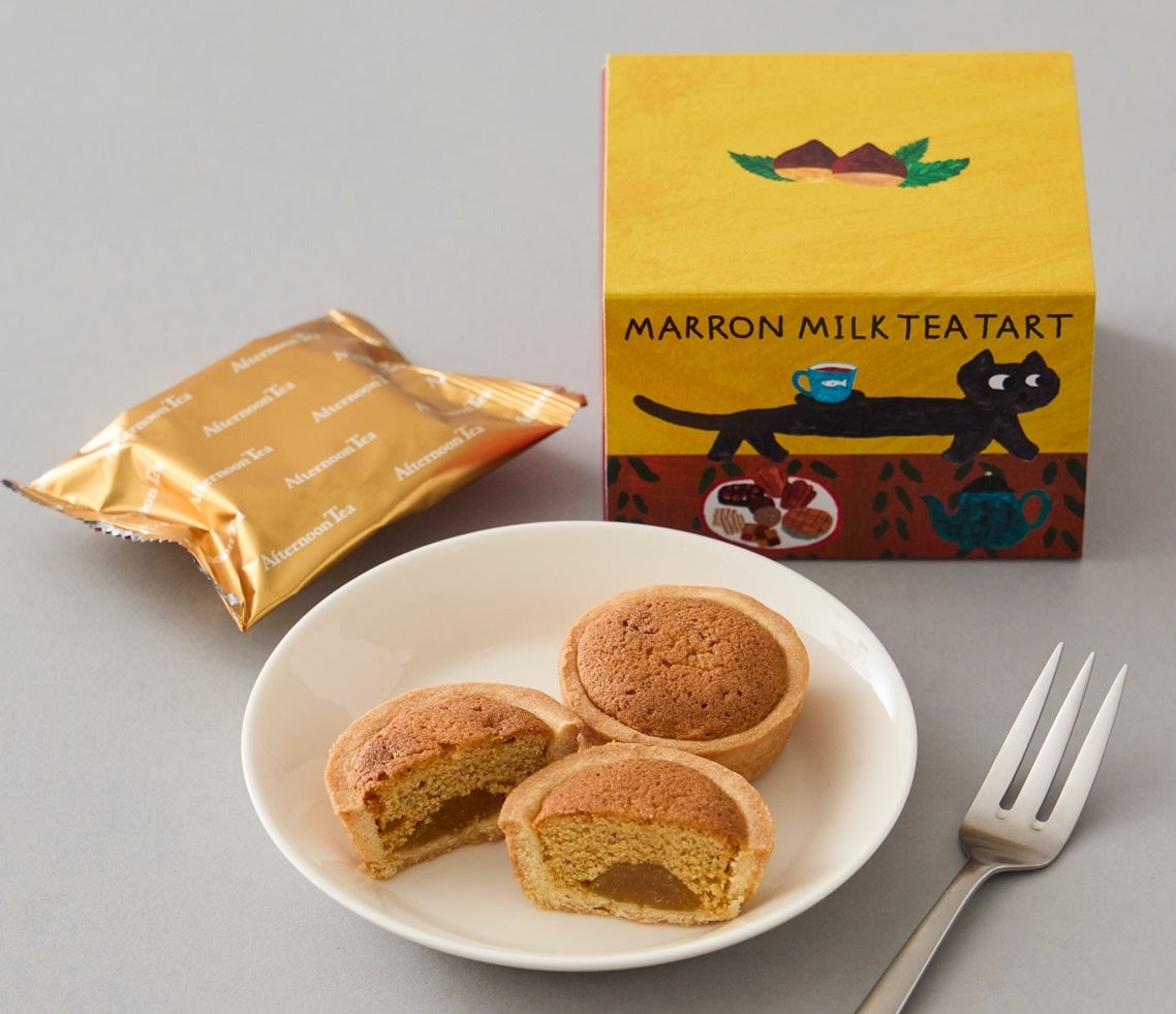 そのほか、シンプルなバターサブレ、栗バターサブレ、さつまいもバターサブレをクッキー缶に詰め合わせた「芋栗バターサブレ」、蜜漬けマロンを入れて焼き上げた「ひとつぶ栗のミルクティータルト」、なると金時芋を使ったスイートポテトやマロンクリーム入りのダックワーズを秋の紅茶とセットにした「オータムティータイムバスケット」など、多彩なラインナップが登場。Mogu Takahashiさんが描く秋らしい色使いのイラストをあしらった限定パッケージで発売します。