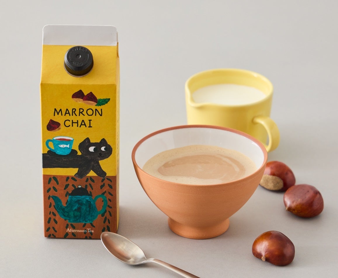 そんなティールームの味が簡単に再現できると好評いただいているリキッドチャイ(希釈用・加糖タイプ)に、この秋、栗バージョンの「マロンチャイ」が新登場。牛乳を加えるだけで、マロンの芳醇な香りが広がる秋らしい味わいの “チャイ” がお楽しみいただけます。