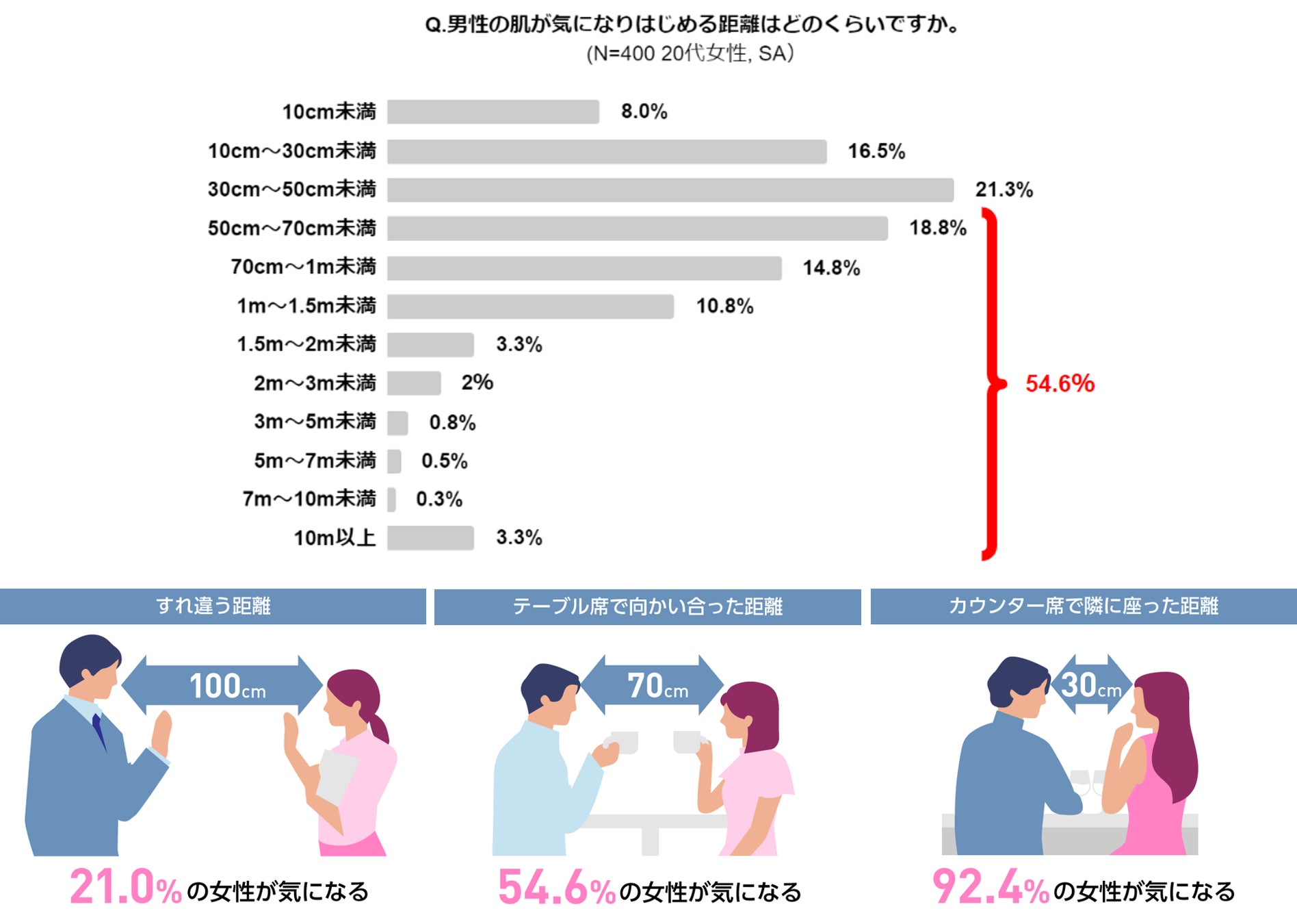 「男性の肌が気になりはじめる距離はどのくらいですか。」と質問したところ、「50cm~70cm未満」~「10m以上」に54.6%の回答が集まり、距離が離れていても男性の肌が気になる女性がいることが分かりました。30cm未満の距離まで近づくと、92.4%の女性が肌を気にするようです。この距離を身近に例えますと、「30cm」はバーでカウンターに座った際の隣の相手との距離、「70cm」はカフェやレストランでテーブル席に座った際の対面相手との距離、「1.0m(100cm)」は男女がすれ違う時の距離に相当します。
