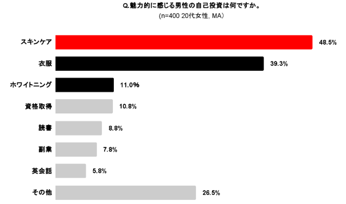 「魅力的に感じる男性の自己投資は何ですか。」と質問したところ、「スキンケア」が約半数の48.5%と最も多い回答となりました。2位に「衣服」3位に「ホワイトニング」と“外見面”に関する項目がランクインし、「資格取得」や「読書」など“スキル面”に関する項目を上回りました。