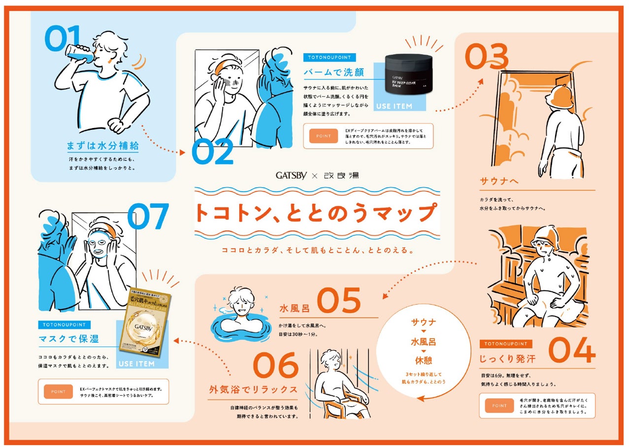 ギャツビーはサウナで効率的に「心と体+“肌”」をととのえるための手順をまとめた「トコトン、ととのうマップ」を作成しました。スペシャルコラボ期間中、男性の来場者を対象に、マップに記載の毛穴洗浄バーム「EXディープクリアバーム」と、毛穴肌集中ケアマスク「EXパーフェクトマスク」(ともに2023年8月新発売)のサンプルを無料配布いたします。改良湯にて「トコトン、ととのうマップ」を参考に、「心と体+“肌”」をととのえる新体験をお楽しみください。