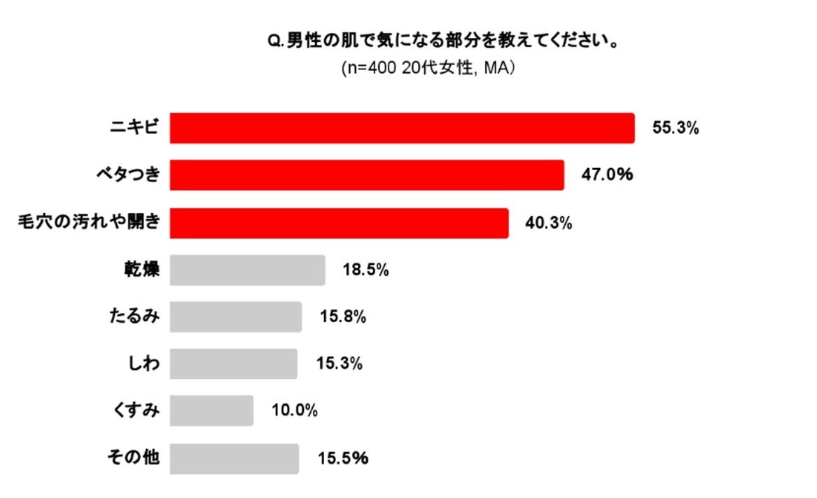 「男性の肌で気になる部分を教えてください。」と質問したところ、「ニキビ」「ベタつき」「毛穴汚れや開き」がトップ3という結果となりました。「ニキビ」「ベタつき」のような見た目が分かりやすい症状だけでなく、「毛穴汚れ」のような細かい肌の症状まで多くの女性は気にしていることが分かりました。