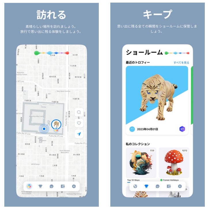 今回の連動企画は、 CS社が2023年4月3日(日)にリリースしたアプリ「サイバートロフィー」を活用しました。『NAKED FLOWERS 2023 桜 世界遺産・二条城』の開催期間中、「サイバートロフィー」をダウンロードした来場者が二条城の特定のスポットに行くと、唐門(重要文化財)に描かれている虎や鶴、蝶々などが限定ARトロフィーとなって出現。来場者は限定ARトロフィーをゲットし、カスタマイズ可能なNFTとしてコレクションしていくことができます。限定トロフィーは獲得すると識別番号が付与されますので、お客様だけの特別なデジタルの記念品になります。獲得したARオブジェクトは将来NFTに自動的に交換され、ユーザーのコレクションであると同時にNFTマーケットプレイスで売買も可能となる予定です。