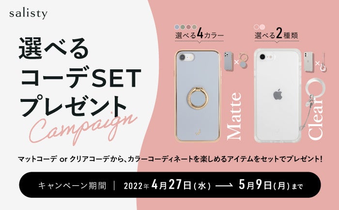さらに同商品がもらえるプレゼントキャンペーンを開催。ご応募いただいた方の中から、抽選で6名様に【マットカラーセット】または【クリアセット】をプレゼント。「salisty」のコーデセットで自分らしいコーディネートをお楽しみください。