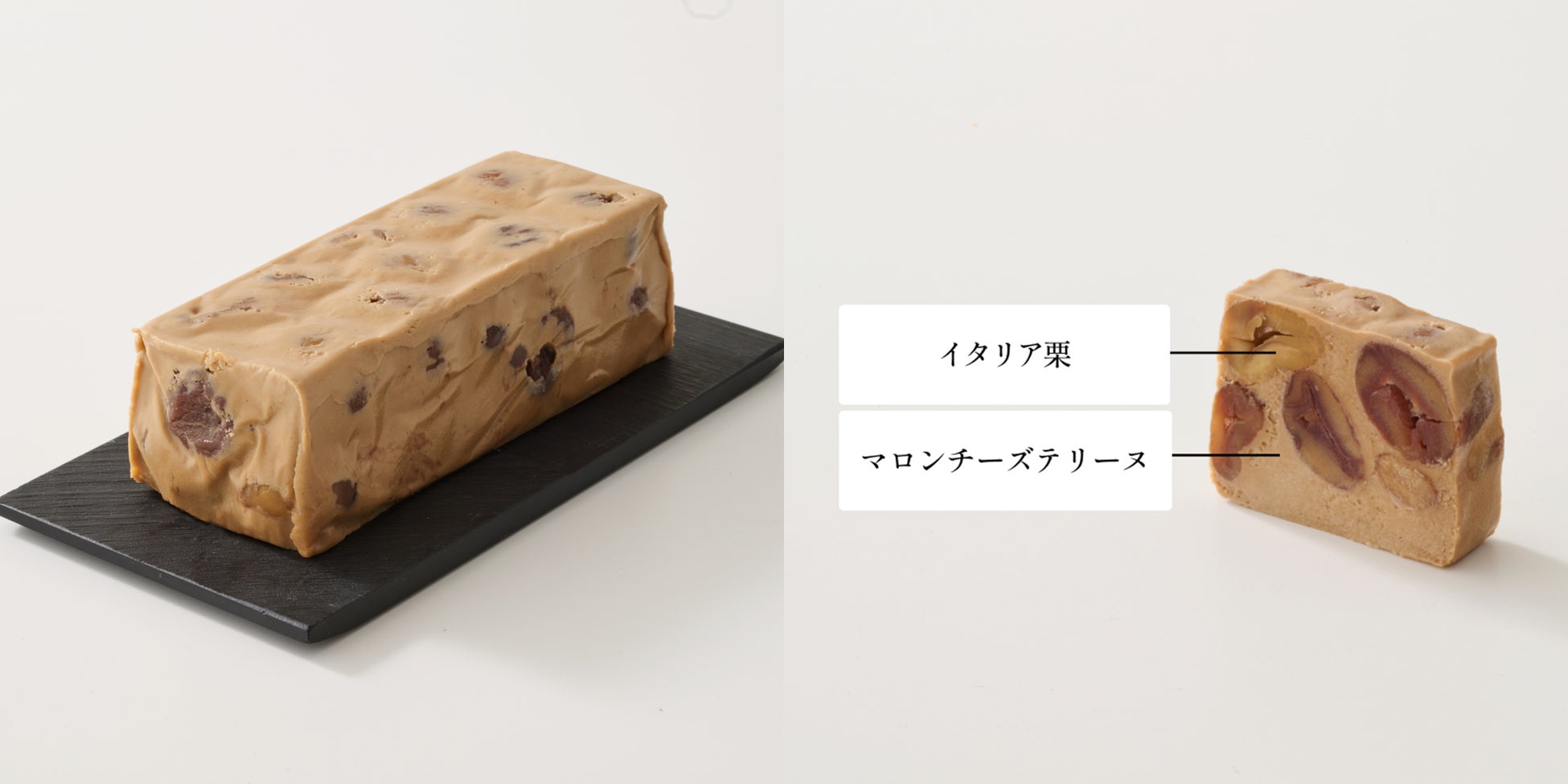 ゴロゴロっとしたイタリア栗をマロンチーズテリーヌに混ぜ、どこを食べても栗の甘みや香ばしさを贅沢にお楽しみいただけます。