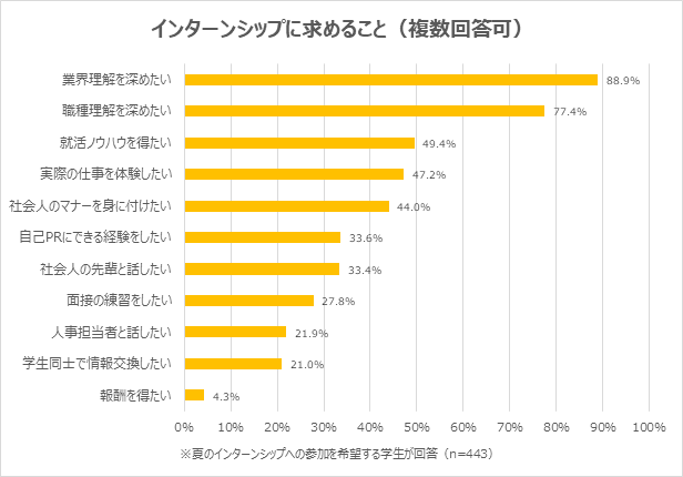 (3) インターンシップに求めることは「業界理解を深めたい」が最多。次いで「職種理解を深めたい」