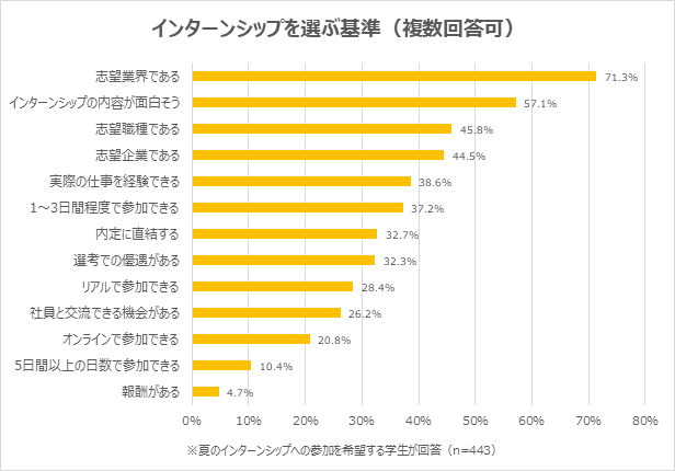 (2) インターンシップを選ぶ基準は「志望業界である」が最多。次いで、「インターンシップの内容が面白そう」