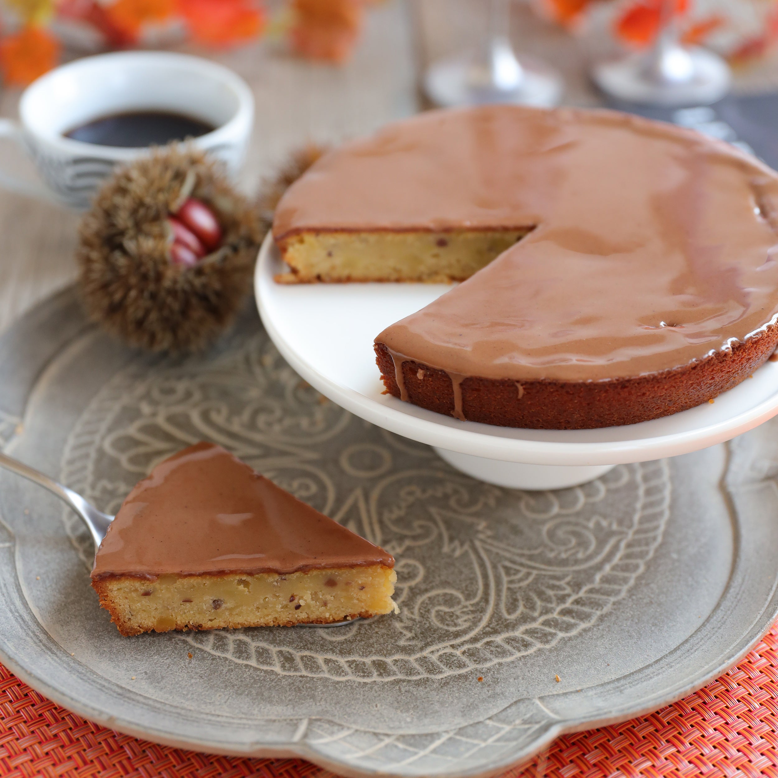 渋皮栗のガトー・ナンテに栗の甘露煮を合わせてココアのフォンダンをあしらいました。