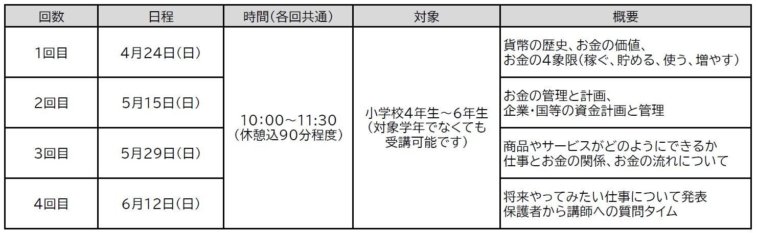今回の内容は、小学校4年生から6年生を対象に、「お金とは何か?」から、「お金の管理と計画」、「仕事とお金の関係」等、生活に不可欠なお金の話をテーマにしています。また本講座はオンライン開催のため、コロナ禍においてもご自宅で安心してご参加いただけます。