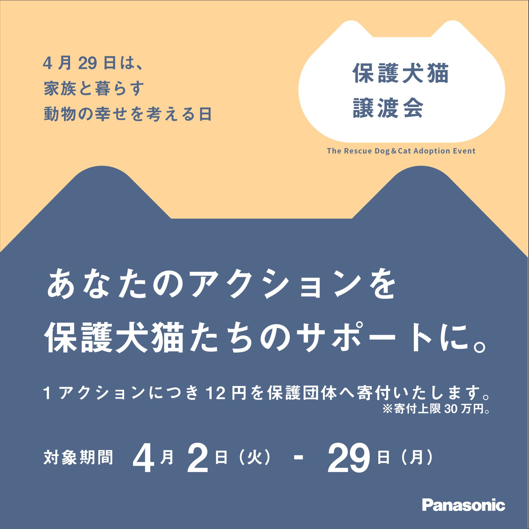 合わせて、「すべての犬猫に幸せになってもらいたい」という想いを込めて、昨年制定(*)した「家族と暮らす動物の幸せを考える日(よいにくきゅうの日)」である4月29日に向けて、パナソニックから動物保護団体に寄付をするSNSチャリティキャンペーンを実施します。