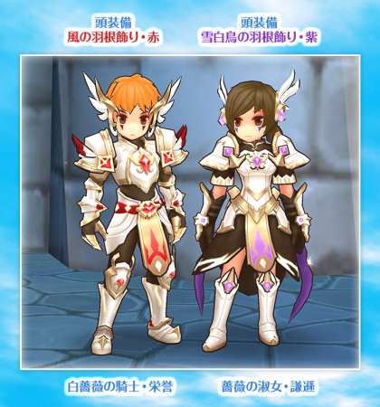 男の子キャラクターには「白薔薇の騎士・栄誉」、女の子キャラクターには「薔薇の淑女・謙遜」といった衣装をはじめ、白く輝く頭装備の「白薔薇のヘルメット」と「光芒のウィッグ」、背部装備の「白鳥の敬意」などがラインナップされています。詳細は、ゲーム内のフェスガチャ画面からご確認ください。
