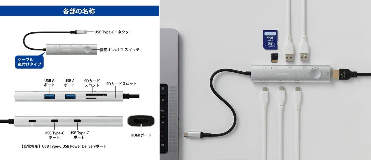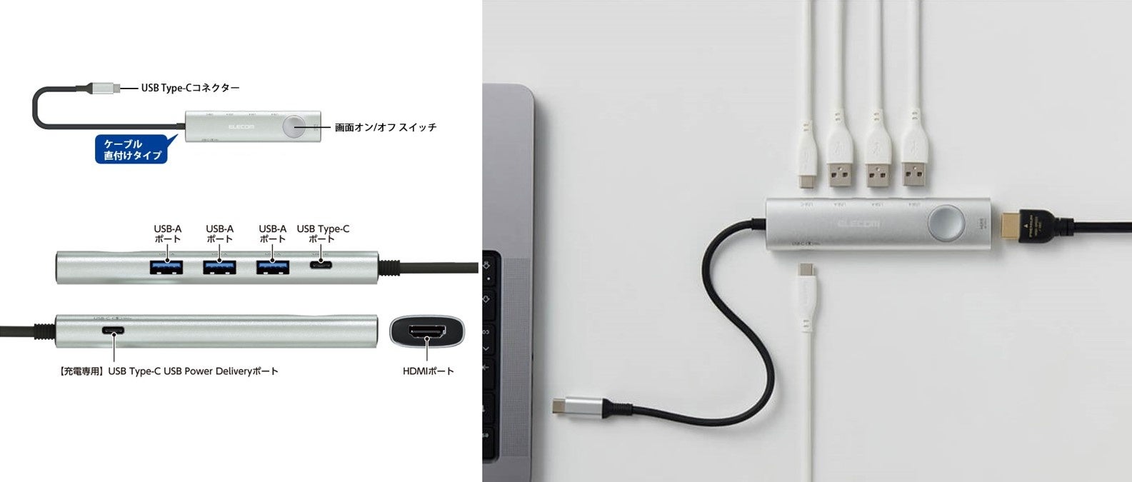 USB Type-C(USB-C)ポートから最大6つのポートに多様な機器を接続できるドッキングステーションです。