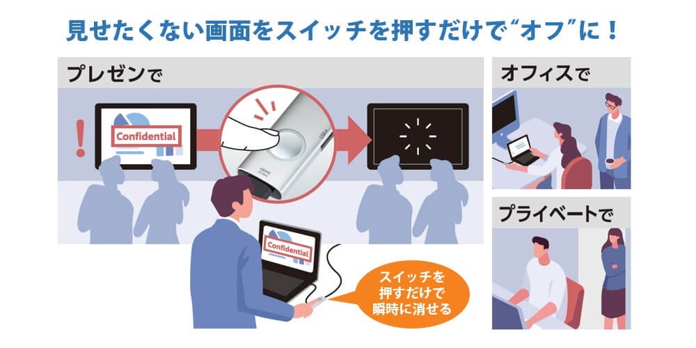 会議やプレゼンの際、内部資料やパスワードの入力ウィンドウなど見られたくない画面を一時的に画面OFFで隠すことができます。展示会やお客様対応時に映像エラーが発生した際なども、慌てることなくスムーズにディスプレイ表示を消して対応できます。